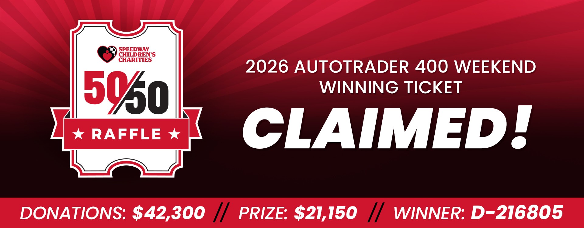 Our generous race fans donated $42,300 during the Autotrader 400 50/50 Raffle. One lucky fan has come forward with the winning ticket and has claimed their prize! Thank you to all who purchased tickets and supported Speedway Children’s Charities!