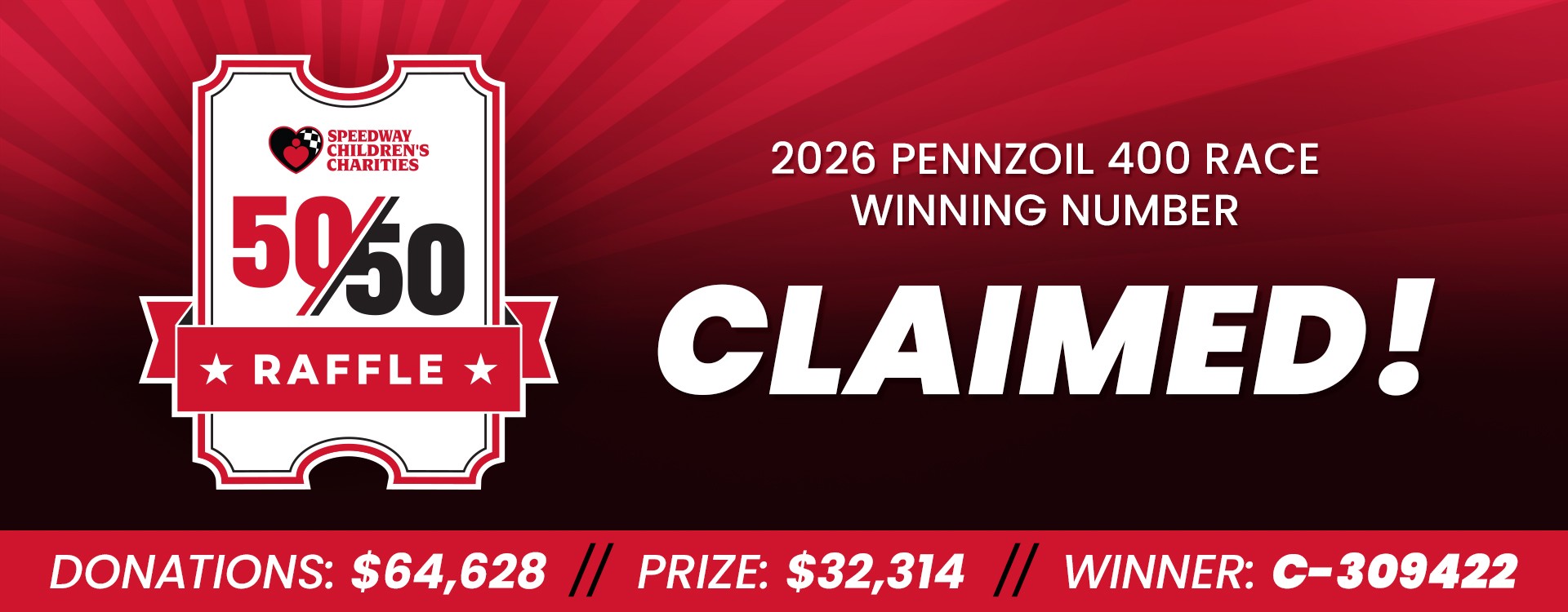 Our generous race fans donated $64,628 for this weekend’s Pennzoil 400 race. One lucky fan has come forward with the winning ticket and has claimed their prize!